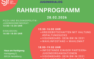 Zusätzlich zu unseren großen Veranstaltungen haben wir noch ein tolles Rahmenprogramm für den 28.02.2026 zusammengestellt. 15:30-16:00 Uhr: Kreidebotschaften mit Haltung #spaltungsucks: Spaltungsucks ist eine Kampagne, die junge Stimmen lauter macht. Um die jungen Stimmen sichtbar zu machen, können vor der Podiumsdiskussion mit einfachen Statements vor unserem Haus am Harbigweg ein [...]