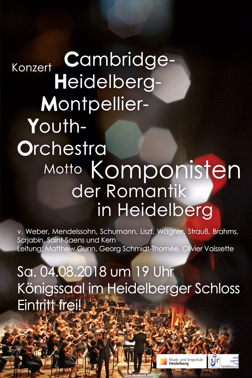 Jährlich organisiert der Stadtjugendring Heidelberg e.V. eine trilaterale Begegnung junger Musiker*innen aus Cambridge, Heidelberg und Montpellier. Die gemeinsamen Orchesterfreizeiten mit englischen Gruppen gibt es schon seit 1962- Montpellier kam 1986 hinzu! Im Laufe der zehntägigen Aufenthalte Anfang der Sommerferien wird ein anspruchsvolles Konzertprogramm erarbeitet. Das internationale Jugendaustauschorchester präsentiert dann im Abschlusskonzert unter der Leitung erfahrener Dirigenten sein Programm, das meist unter einem bestimmten Motto steht. Eindrücke von der Probenzeit und vom festlichen Rahmen dieser Sinfoniekonzerte des CHMYO bietet das Video aus dem Jahr 2015 (s.u.).