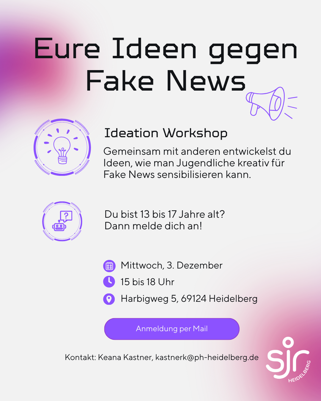 Haus am Harbigweg (Stadtjugendring) Harbigweg 5, Heidelberg, DeutschlandFalschmeldungen sind überall – in Stories, auf TikTok oder in Gruppenchats. Aber wie kann man sie erkennen? Und was kann man dagegen tun? In unserem Ideation-Workshop seid ihr die Kreativen! Gemeinsam entwickelt ihr Ideen, wie Jugendliche am besten für Fake News sensibilisiert werden können – mit VR-Anwendungen, Spielen oder Projekten. [...]