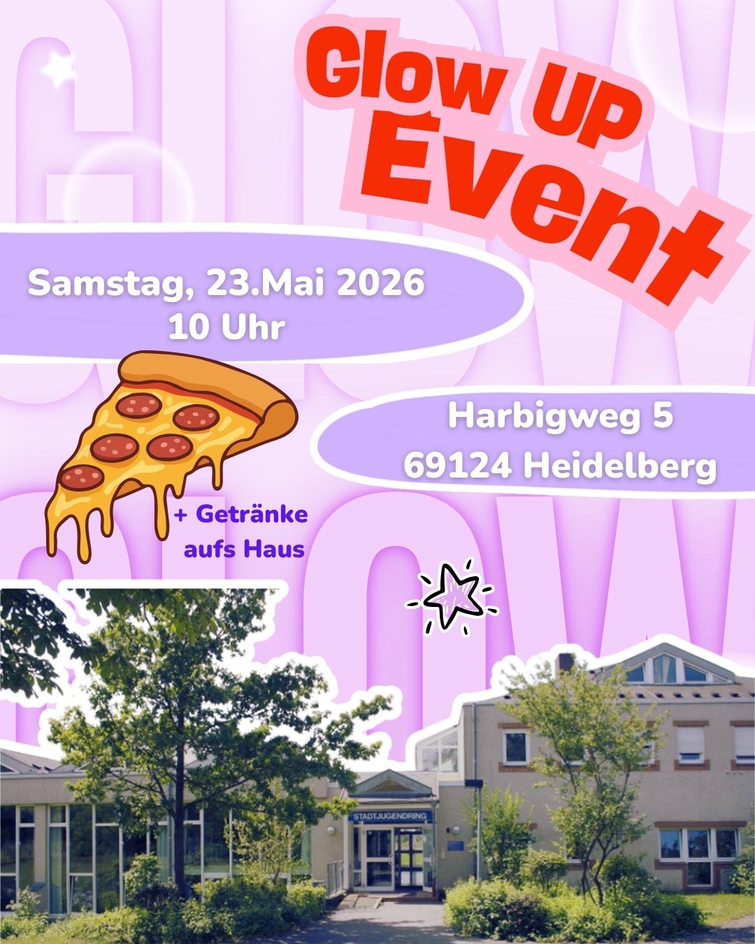 Haus am Harbigweg (Stadtjugendring) Harbigweg 5, Heidelberg, DeutschlandUnser GlowUp-Event wird auf den 23.05.2026 verschoben – für unsere gemeinsame Verbandsarbeit Unser GlowUp-Event war ursprünglich für den 7. März 2026 geplant. Da an diesem Termin jedoch eine große Feier der Ungarische Pfadfinder mit Gästen aus Ungarn und ganz Deutschland stattfindet, möchten wir bewusst Raum für diese wichtige Verbandsarbeit schaffen. [...]